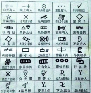 小偷在作案前有时会在居民家的门、墙上做一些标记,每一种记号代表一个含义,一般人看不懂,但同行一看便知道这个家庭的情况。不过派出所干警也不是吃素的,很快破译了这些记号的含义(如上图),并且在辖区内广为张贴,告知居民。